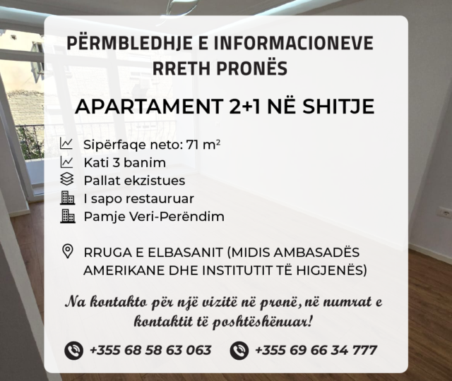 Shitet apartament 2+1, te rruga e Elbasanit, midis Ambasadës Amerikane dhe Institutit të Higjenës, Tiranë.