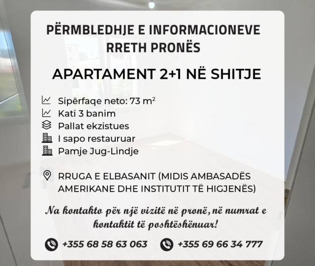 Shitet apartament 2+1, te rruga e Elbasanit, midis Ambasadës Amerikane dhe Institutit të Higjenës, Tiranë.