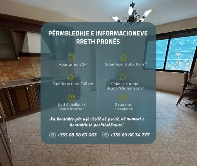 Apartament 2+1 në shitje, te Shkolla e Kuqe, në rrugën “Qemal Stafa”, Tiranë.