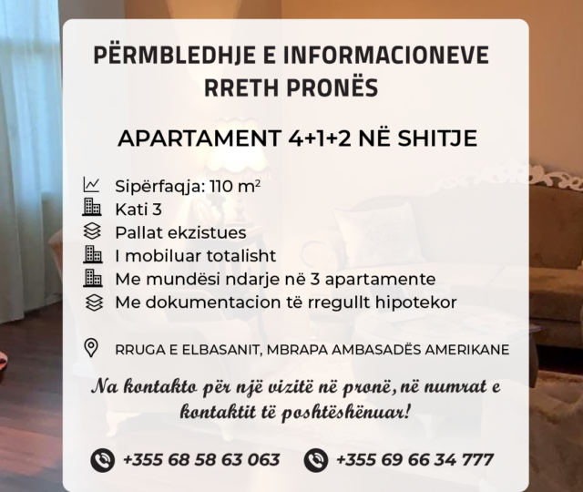 Shitet apartament 4+1+2 te rruga e Elbasanit, mbrapa Ambasadës Amerikane, Tiranë.