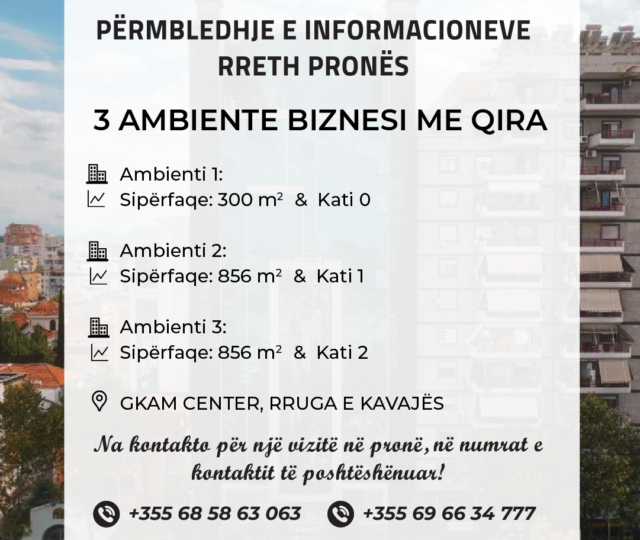 Jepen me qira 3 ambiente biznesi tek Gkam Center, në rrugën e Kavajës, Tiranë.