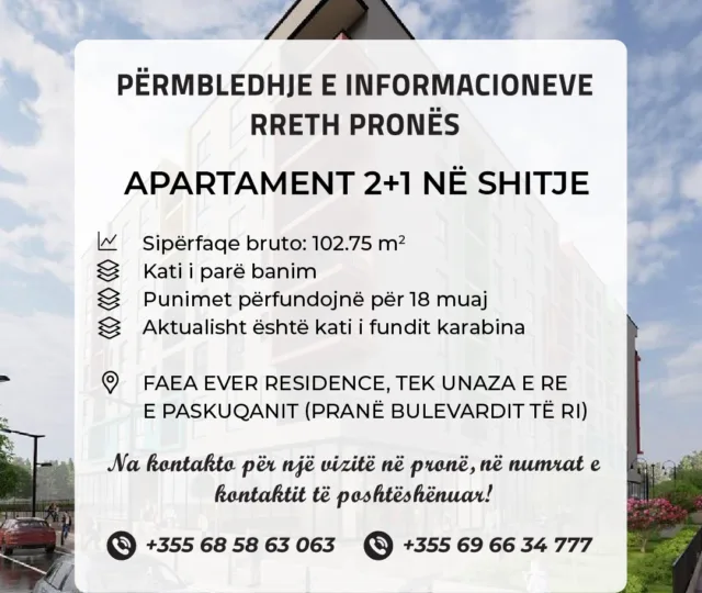 Apartament 2+1 në shitje, te rezidenca FAEA EVER, tek Unaza e Re e Paskuqanit, pranë Bulevardit të Ri, Tiranë.