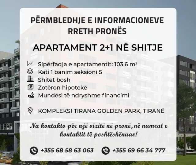 Apartament 2+1 në shitje, te kompleksi Tirana Golden Park, Tiranë.