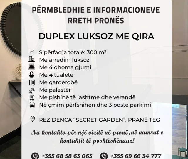 Duplex me qira, në rezidencën “Secret Garden”, pranë TEG, Tiranë.