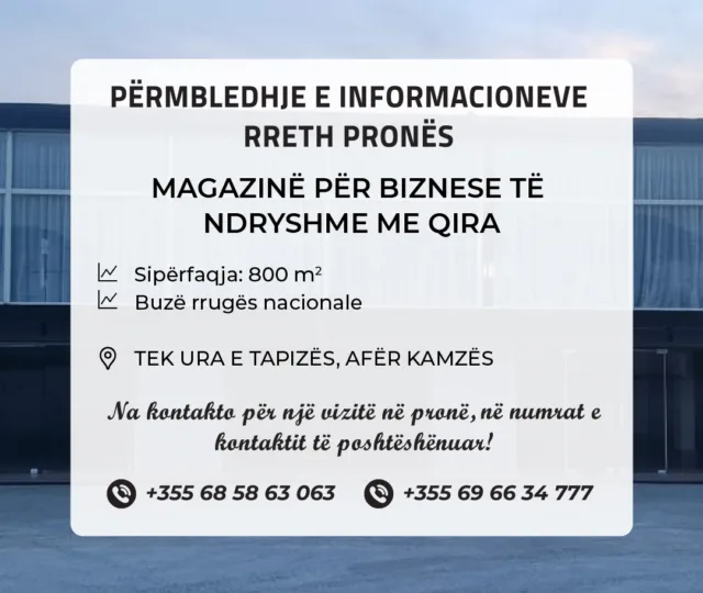 Magazinë për biznese të ndryshme me qira, tek Ura e Tapizës, afër Kamzës, Tiranë.