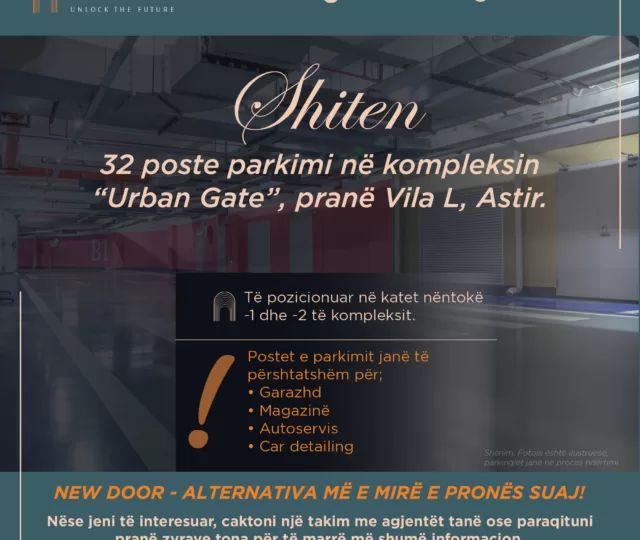 Shiten 32 poste parkimi në kompleksin “Urban Gate”, pranë Vilës L, Astir, Tiranë.